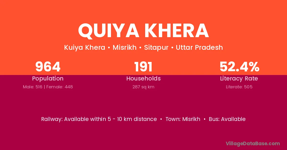 Quiya Khera village has a total population of 964 people, of which 516 are males and 448 are females.