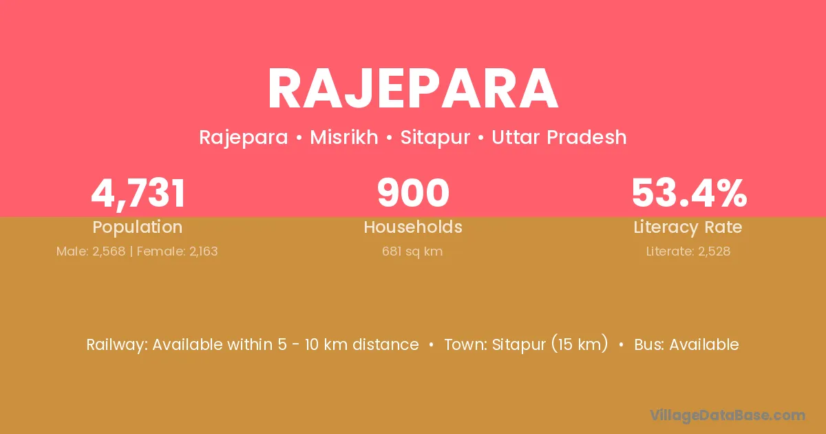 Sitapur (15 km) is the nearest town to Rajepara village for major economic activities and is located approximately 15 km away.