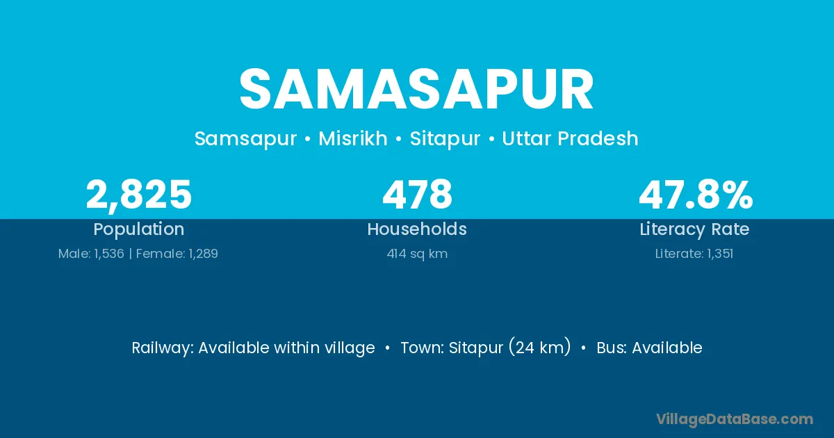 Sitapur (24 km) is the nearest town to Samasapur village for major economic activities and is located approximately 24 km away.