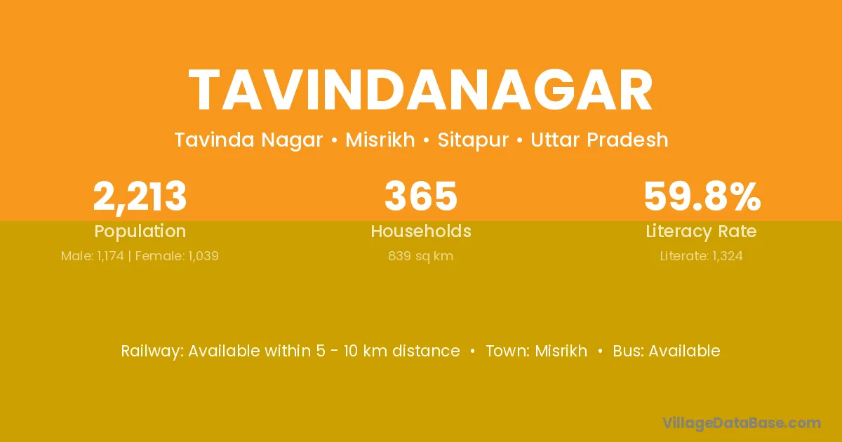 Tavindanagar village has a total population of 2,213 people, of which 1,174 are males and 1,039 are females.