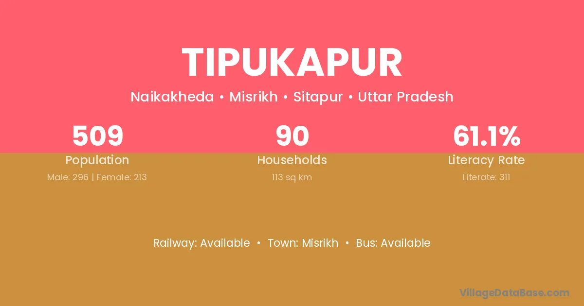 Tipukapur village has a total population of 509 people, of which 296 are males and 213 are females.