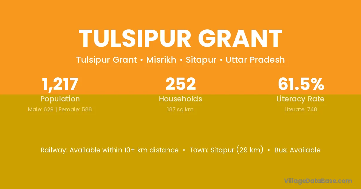 Sitapur (29 km) is the nearest town to Tulsipur Grant village for major economic activities and is located approximately 29 km away.