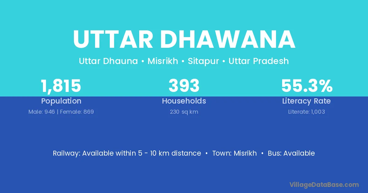 Uttar Dhawana village has a total population of 1,815 people, of which 946 are males and 869 are females.