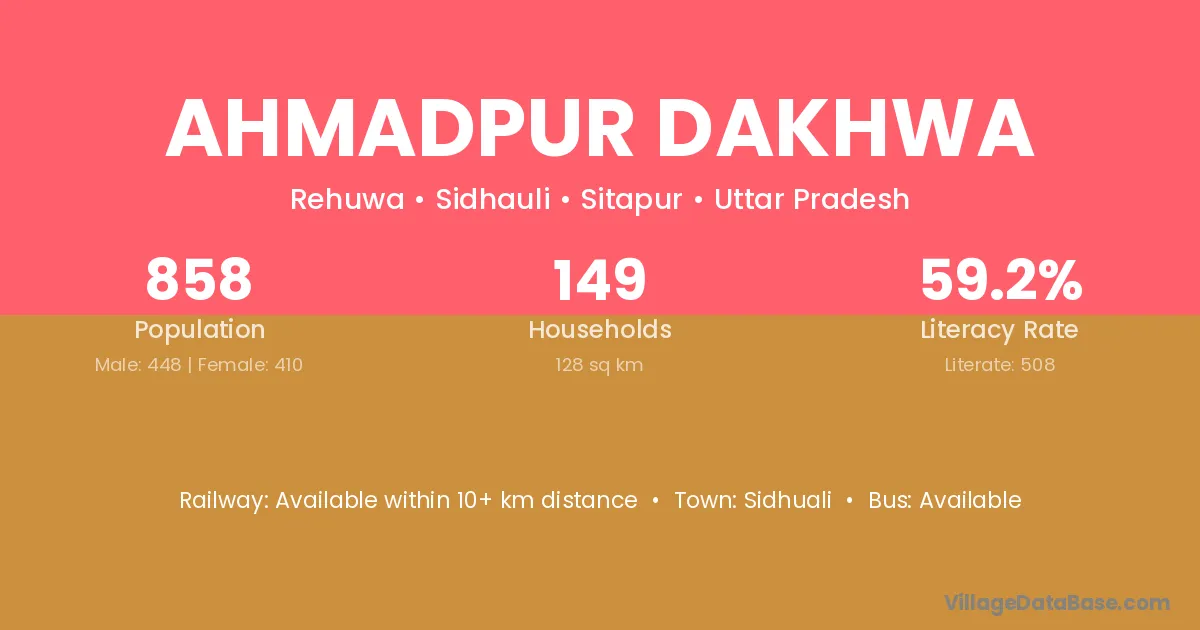 Ahmadpur Dakhwa village has a total population of 858 people, of which 448 are males and 410 are females.