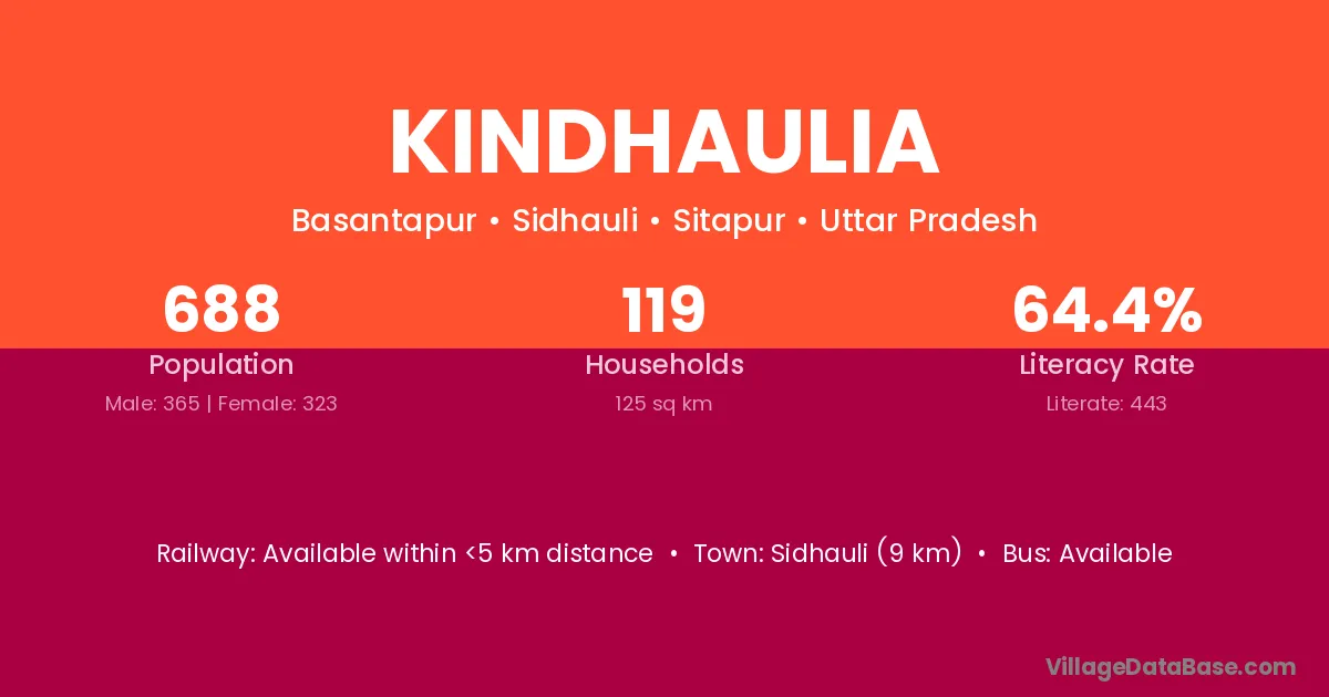 Kindhaulia village has a total population of 688 people, of which 365 are males and 323 are females.