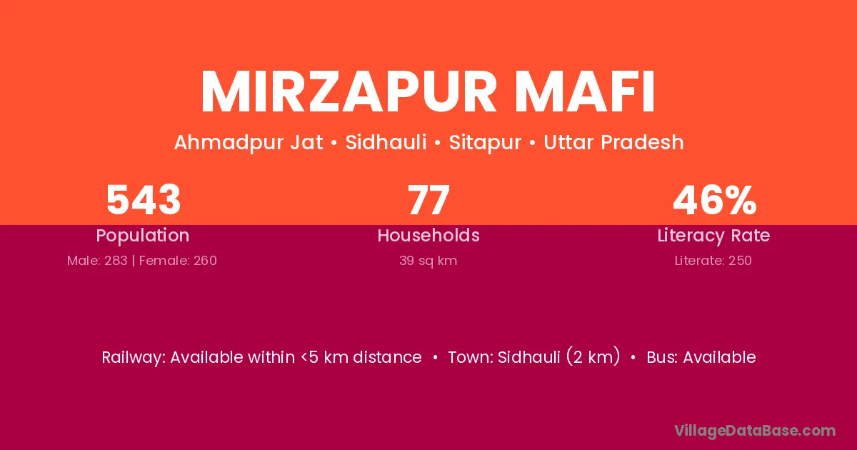 Mirzapur Mafi village has a total population of 543 people, of which 283 are males and 260 are females.