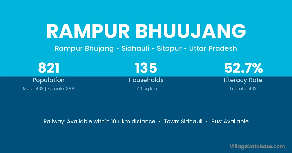 Rampur Bhuujang village has a total population of 821 people, of which 433 are males and 388 are females.