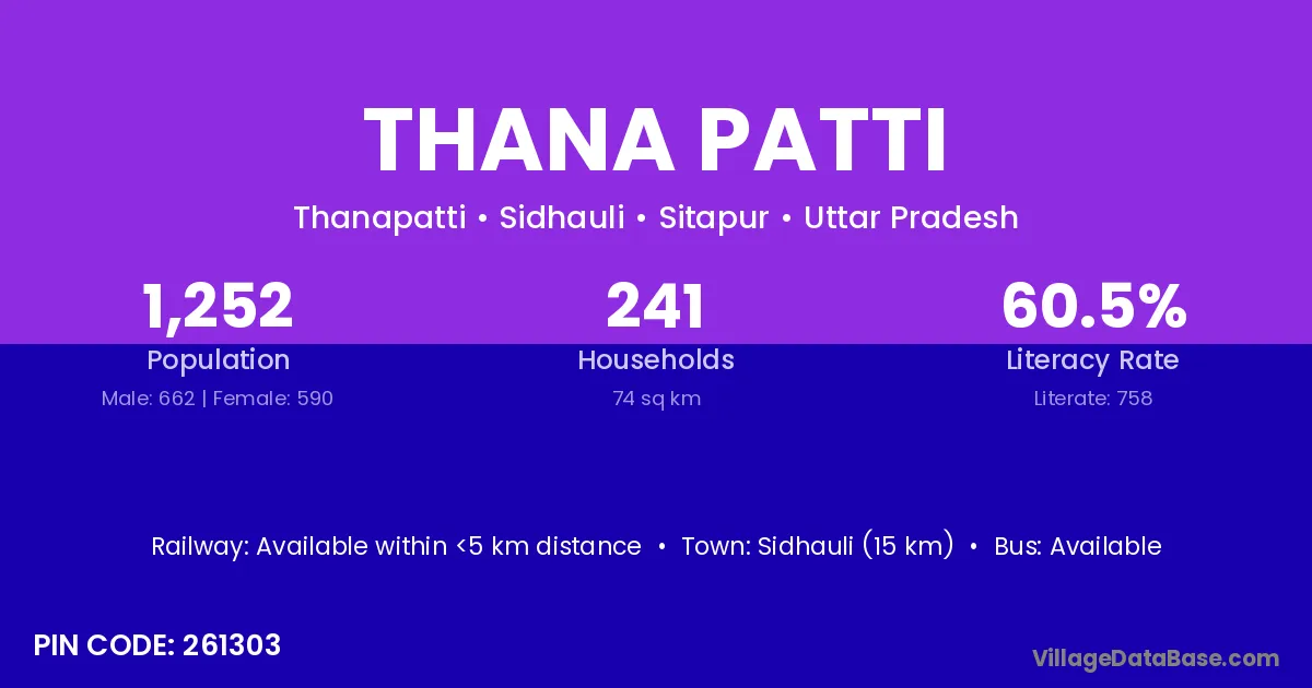 Thana Patti village has a total population of 1,252 people, of which 662 are males and 590 are females.