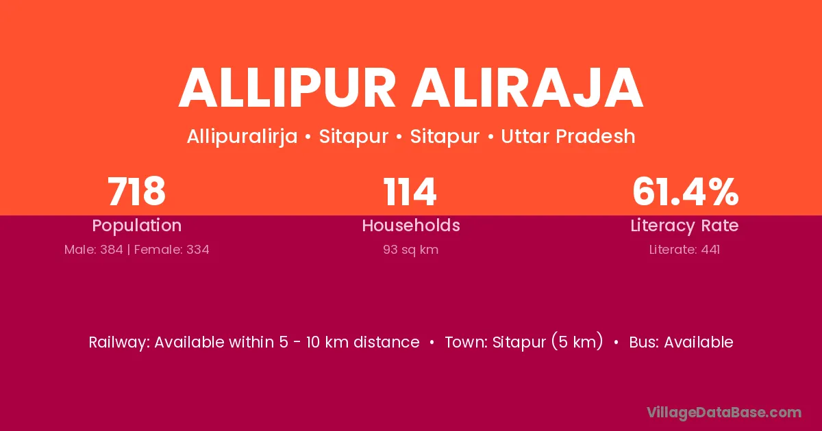 Sitapur (5 km) is the nearest town to Allipur Aliraja village for major economic activities and is located approximately 5 km away.