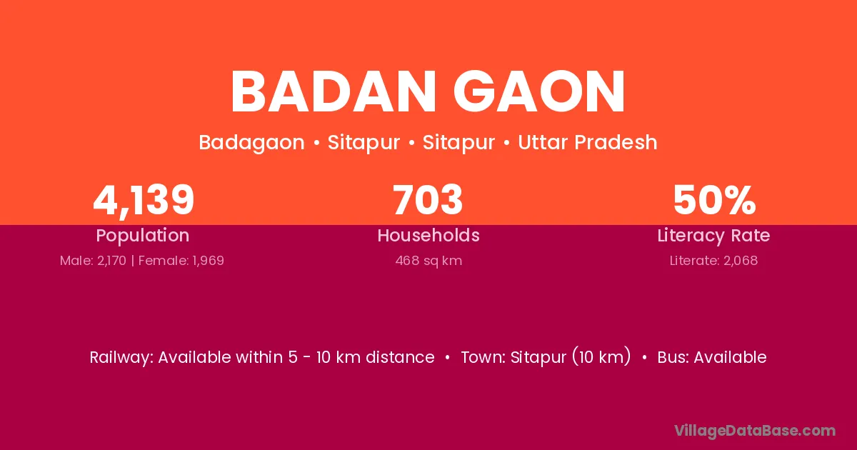 Sitapur (10 km) is the nearest town to Badan Gaon village for major economic activities and is located approximately 10 km away.