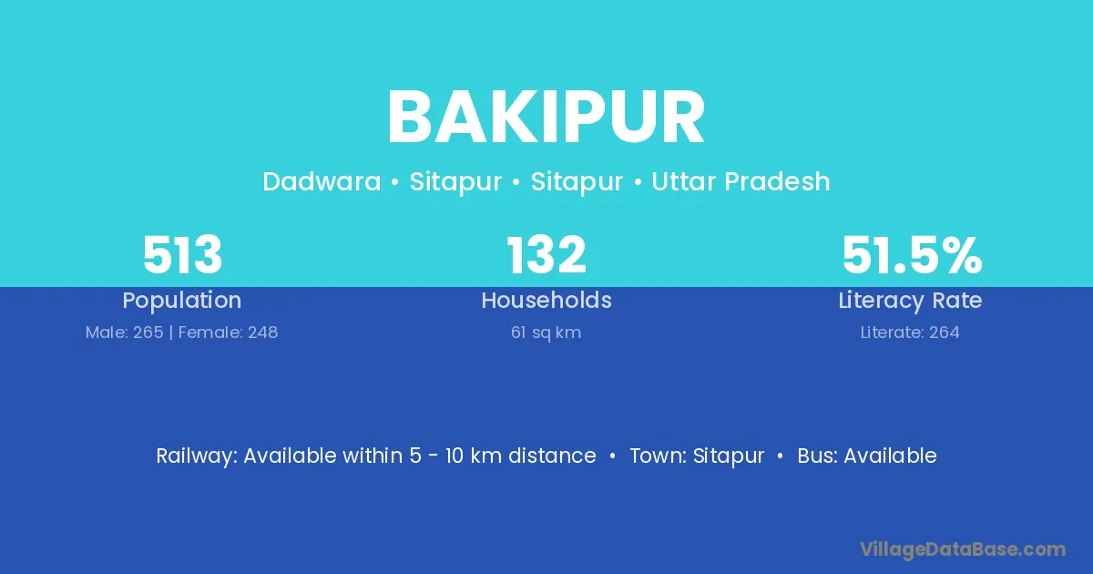 Bakipur village has a total population of 513 people, of which 265 are males and 248 are females.