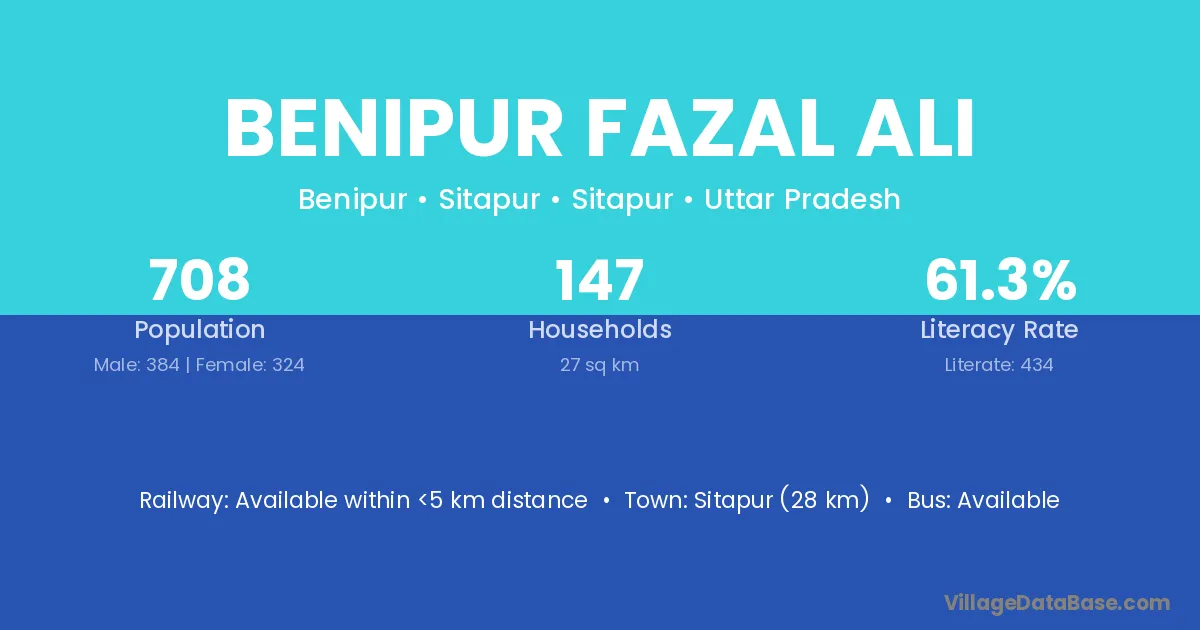 Sitapur (28 km) is the nearest town to Benipur Fazal Ali village for major economic activities and is located approximately 28 km away.