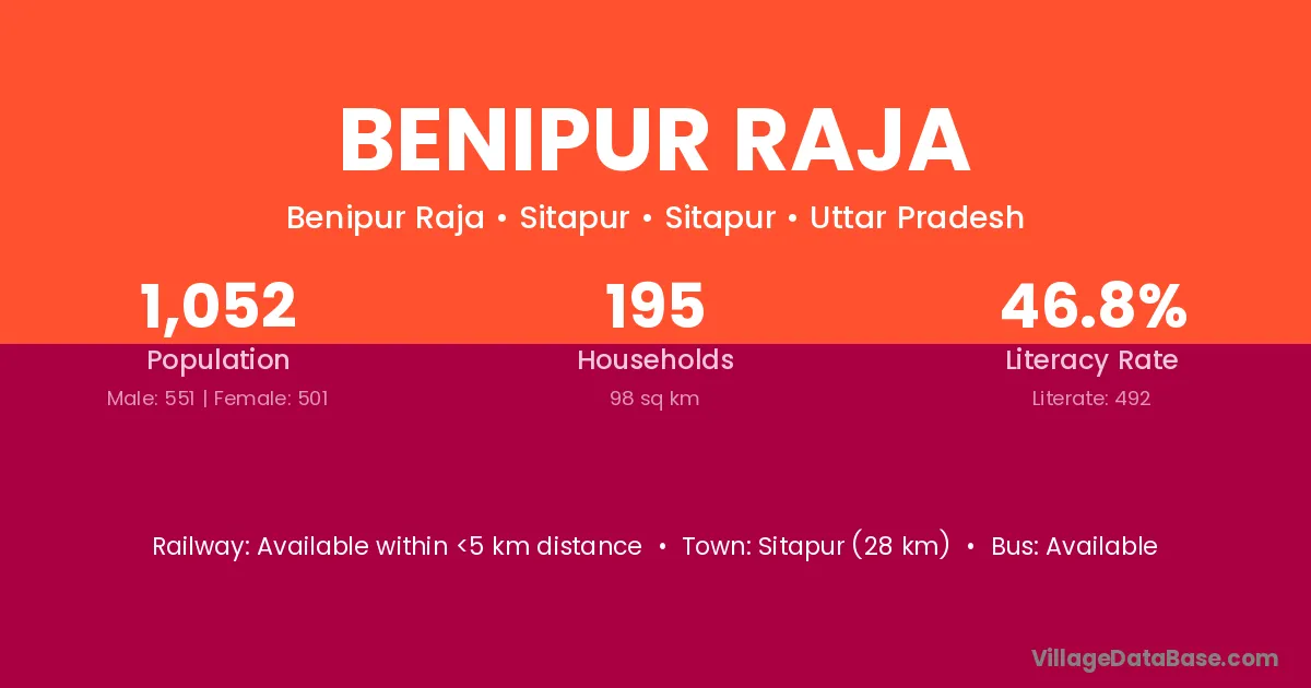 Sitapur (28 km) is the nearest town to Benipur Raja village for major economic activities and is located approximately 28 km away.