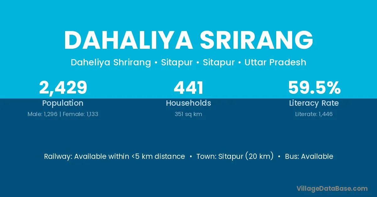 Sitapur (20 km) is the nearest town to Dahaliya Srirang village for major economic activities and is located approximately 20 km away.