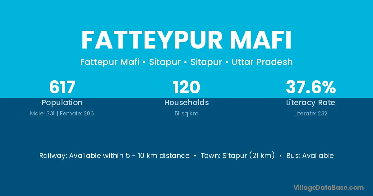 Sitapur (21 km) is the nearest town to Fatteypur Mafi village for major economic activities and is located approximately 21 km away.