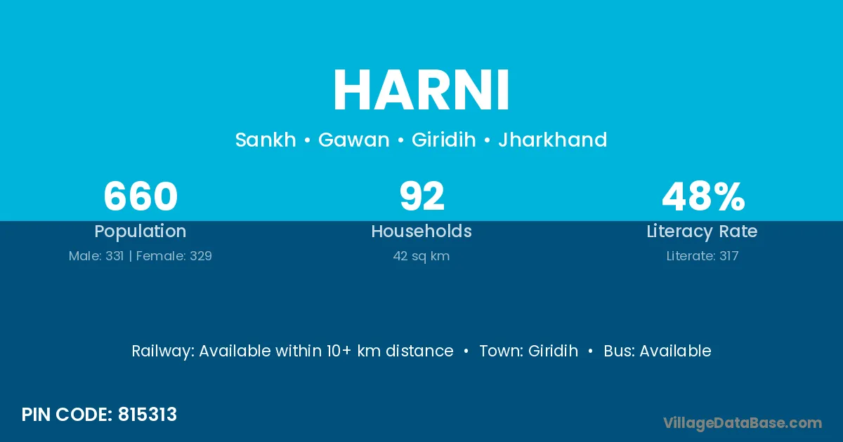 The literacy rate of Harni village is 70.04%. Male literacy stands at 78.23% and female literacy at 61.44%.