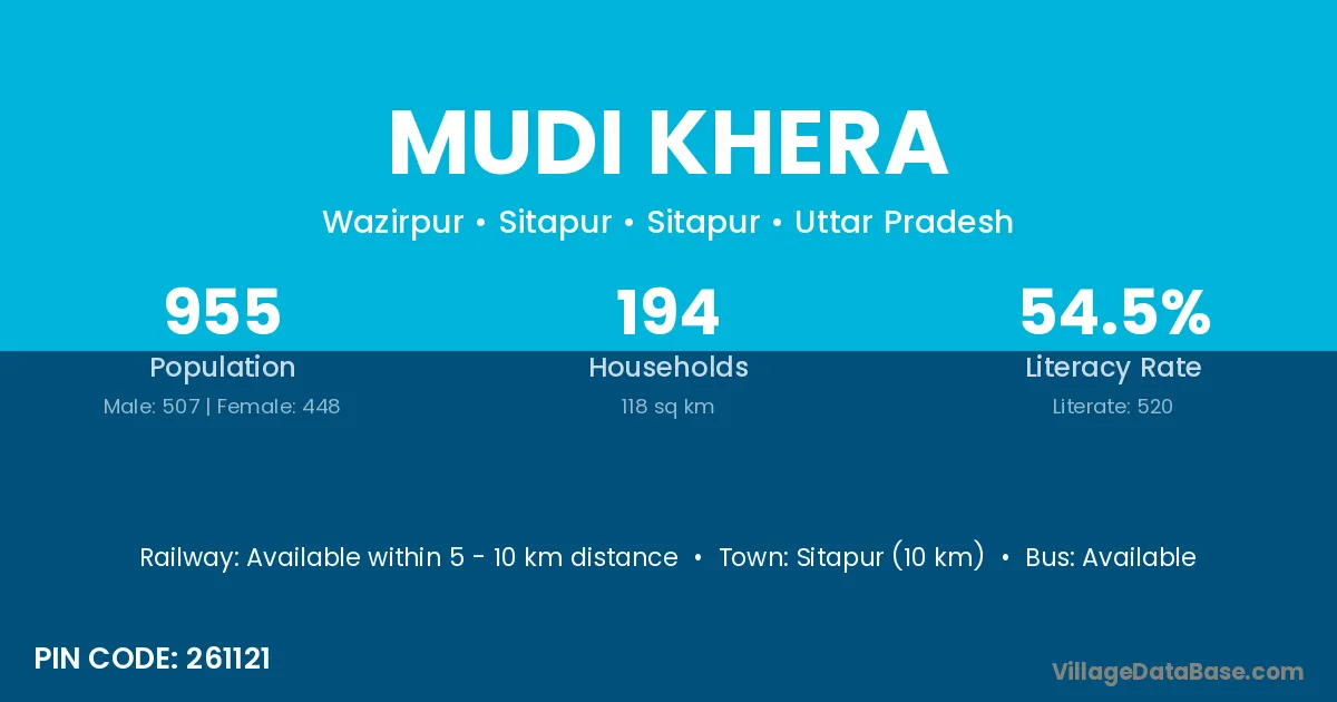 Mudi Khera village has a total population of 955 people, of which 507 are males and 448 are females.