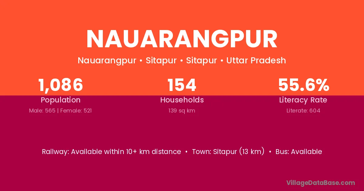 Sitapur (13 km) is the nearest town to Nauarangpur village for major economic activities and is located approximately 13 km away.