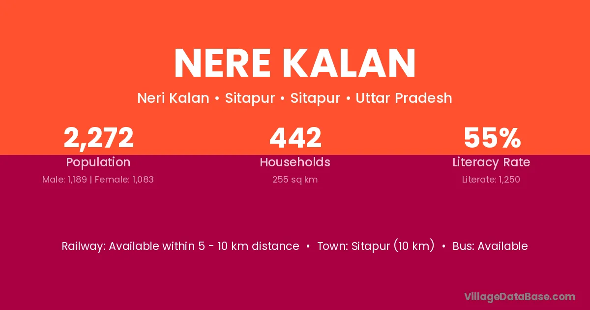 Sitapur (10 km) is the nearest town to Nere Kalan village for major economic activities and is located approximately 10 km away.