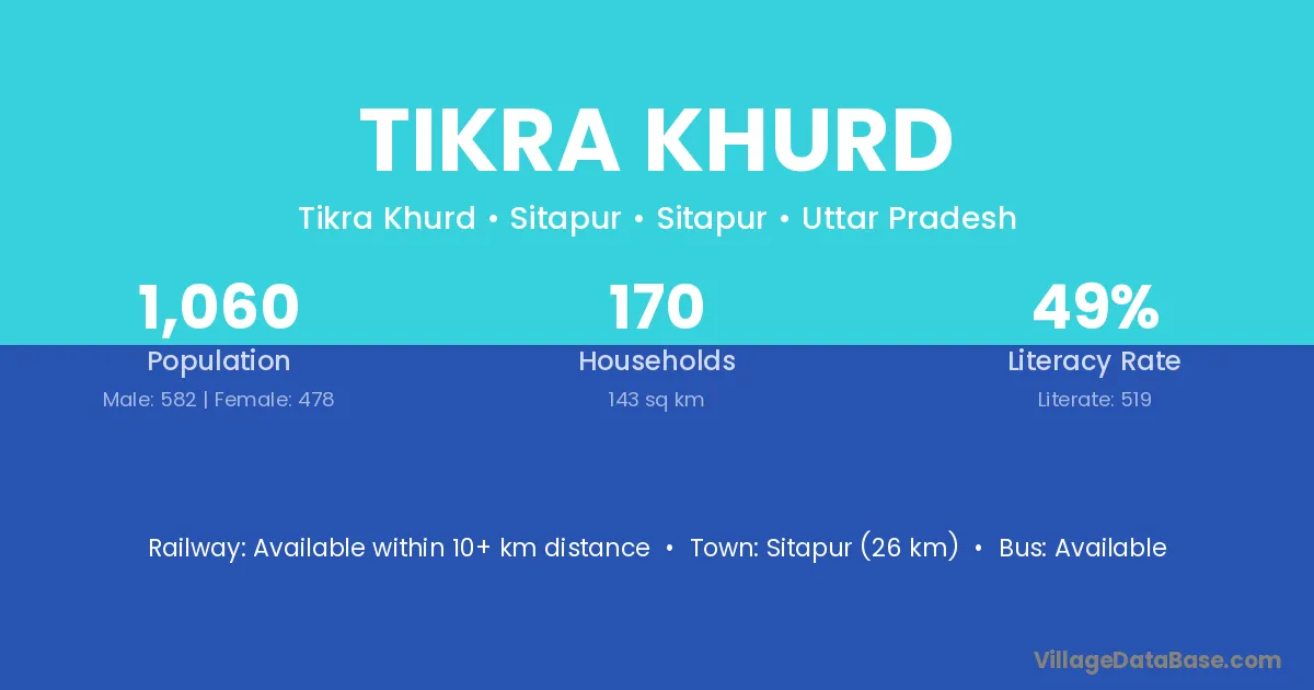 Sitapur (26 km) is the nearest town to Tikra Khurd village for major economic activities and is located approximately 26 km away.