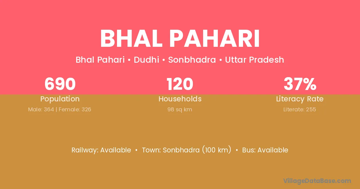 Sonbhadra (100 km) is the nearest town to Bhal Pahari village for major economic activities and is located approximately 100 km away.