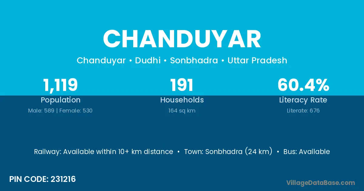 Sonbhadra (24 km) is the nearest town to Chanduyar village for major economic activities and is located approximately 24 km away.