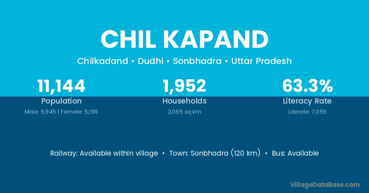Sonbhadra (120 km) is the nearest town to Chil Kapand village for major economic activities and is located approximately 120 km away.