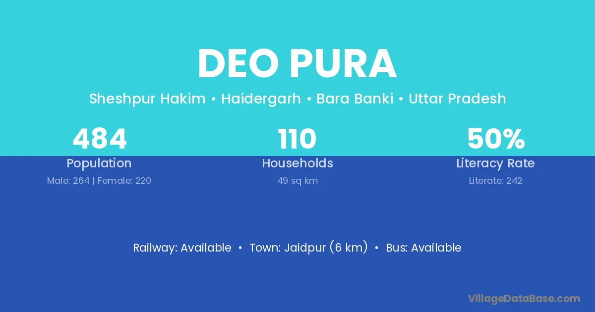The literacy rate of Deo Pura village is 83.02%. Male literacy stands at 93.55% and female literacy at 68.18%.