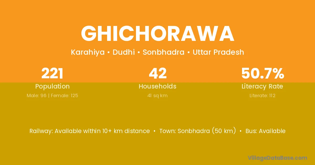 Sonbhadra (50 km) is the nearest town to Ghichorawa village for major economic activities and is located approximately 50 km away.