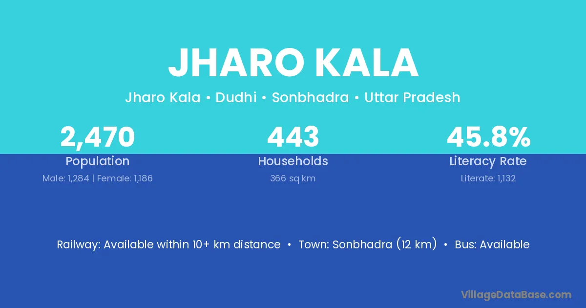 Sonbhadra (12 km) is the nearest town to Jharo Kala village for major economic activities and is located approximately 12 km away.