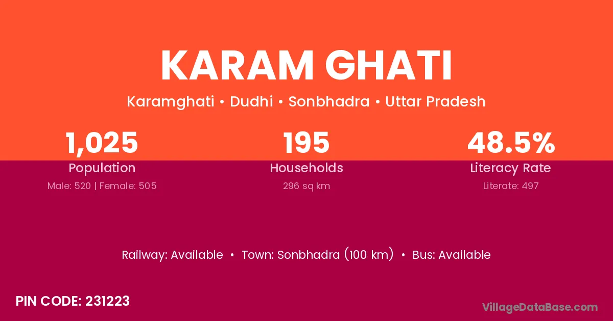 Karam Ghati village has a total population of 1,025 people, of which 520 are males and 505 are females.