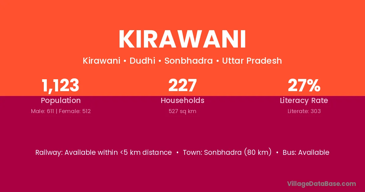 Sonbhadra (80 km) is the nearest town to Kirawani village for major economic activities and is located approximately 80 km away.