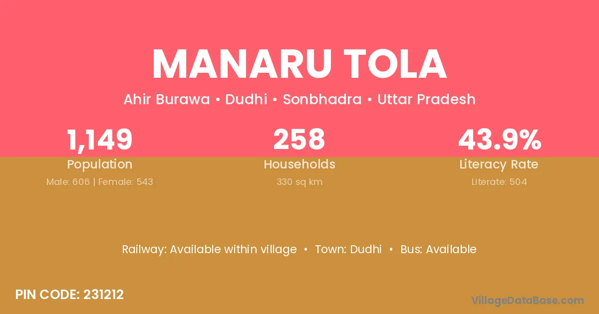 Manaru Tola village has a total population of 1,149 people, of which 606 are males and 543 are females.