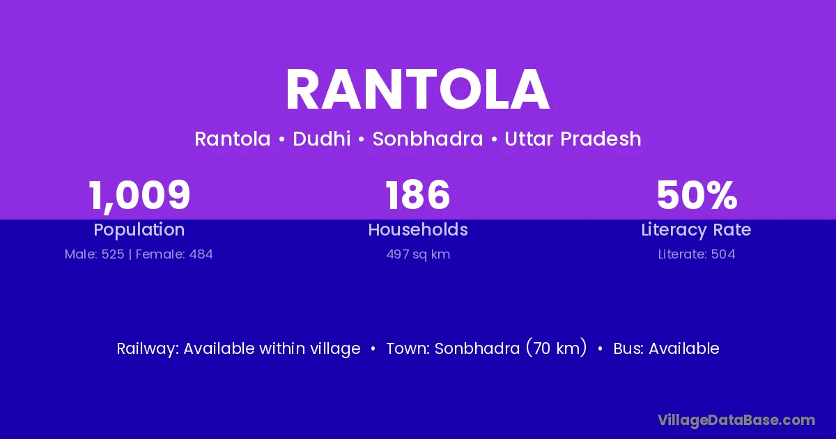 Sonbhadra (70 km) is the nearest town to Rantola village for major economic activities and is located approximately 70 km away.