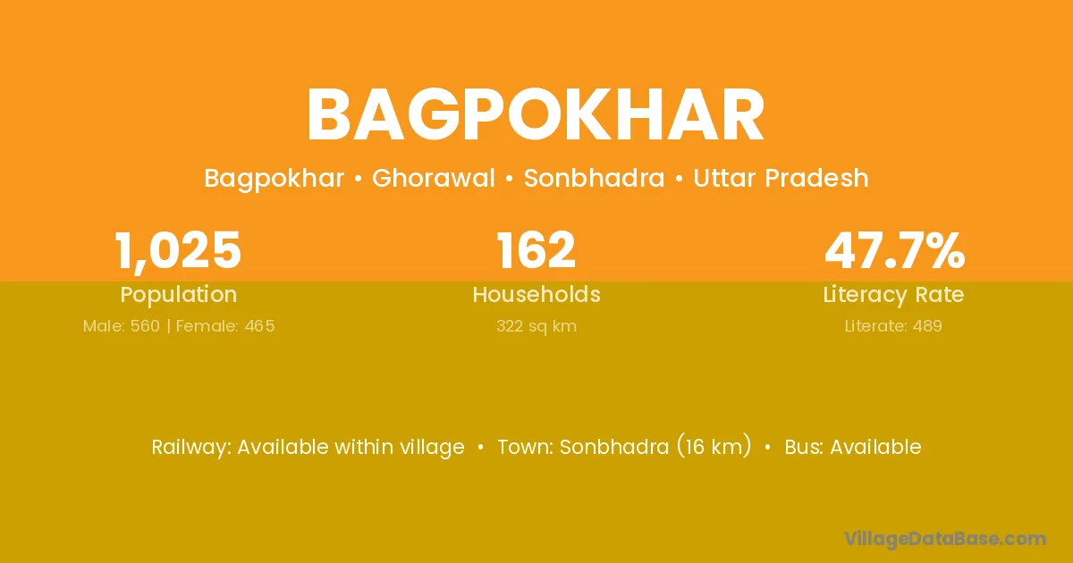 Sonbhadra (16 km) is the nearest town to Bagpokhar village for major economic activities and is located approximately 16 km away.
