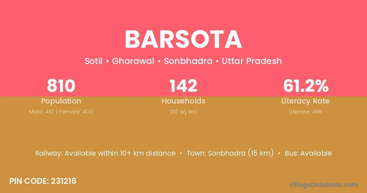 Sonbhadra (15 km) is the nearest town to Barsota village for major economic activities and is located approximately 15 km away.