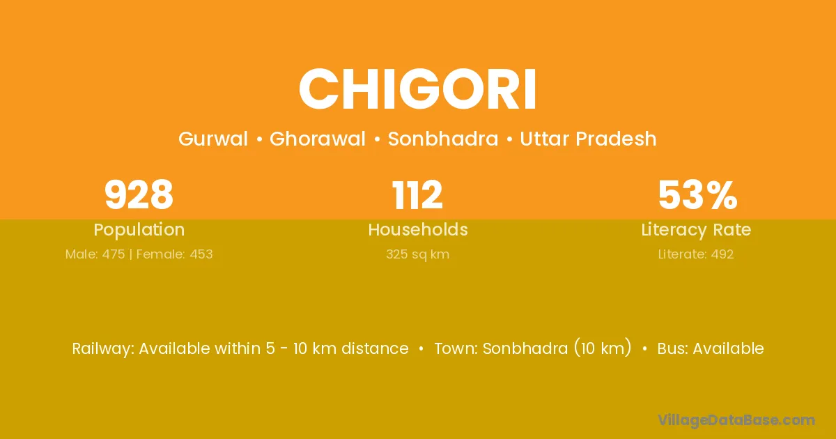 Sonbhadra (10 km) is the nearest town to Chigori village for major economic activities and is located approximately 10 km away.