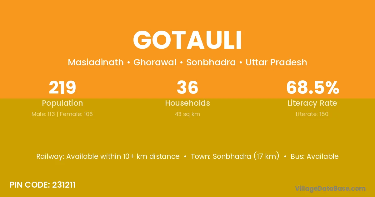 Sonbhadra (17 km) is the nearest town to Gotauli village for major economic activities and is located approximately 17 km away.