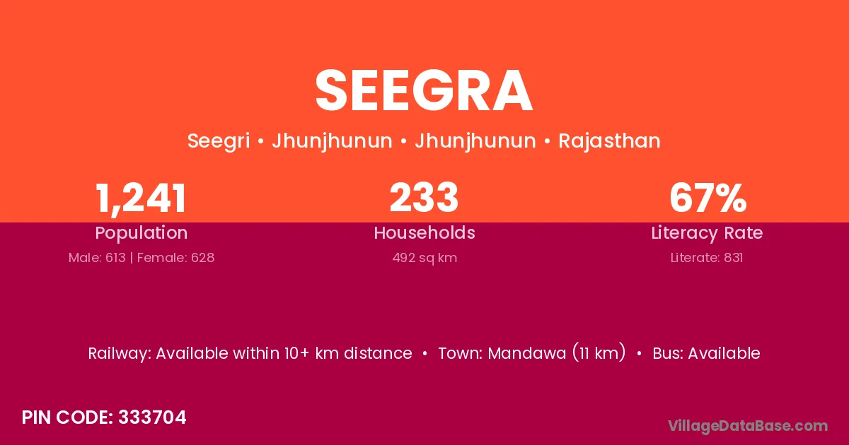 Ghorwal (8 km) is the nearest town to Seegra village for major economic activities and is located approximately 8 km away.