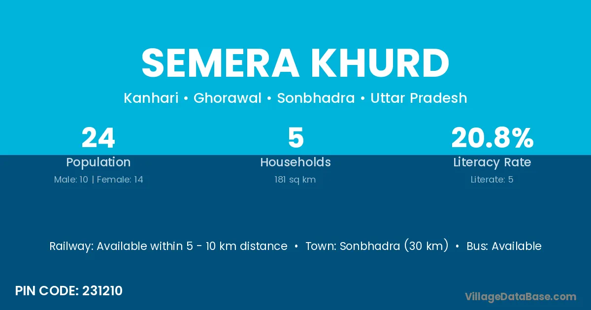 Sonbhadra (30 km) is the nearest town to Semera Khurd village for major economic activities and is located approximately 30 km away.