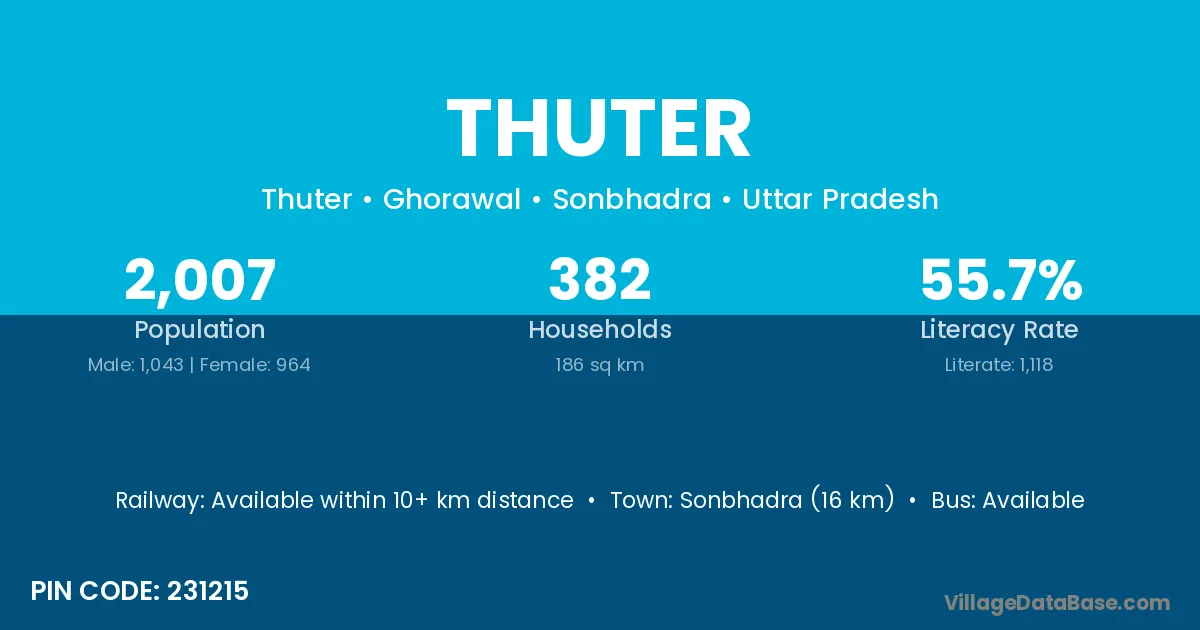 Sonbhadra (16 km) is the nearest town to Thuter village for major economic activities and is located approximately 16 km away.