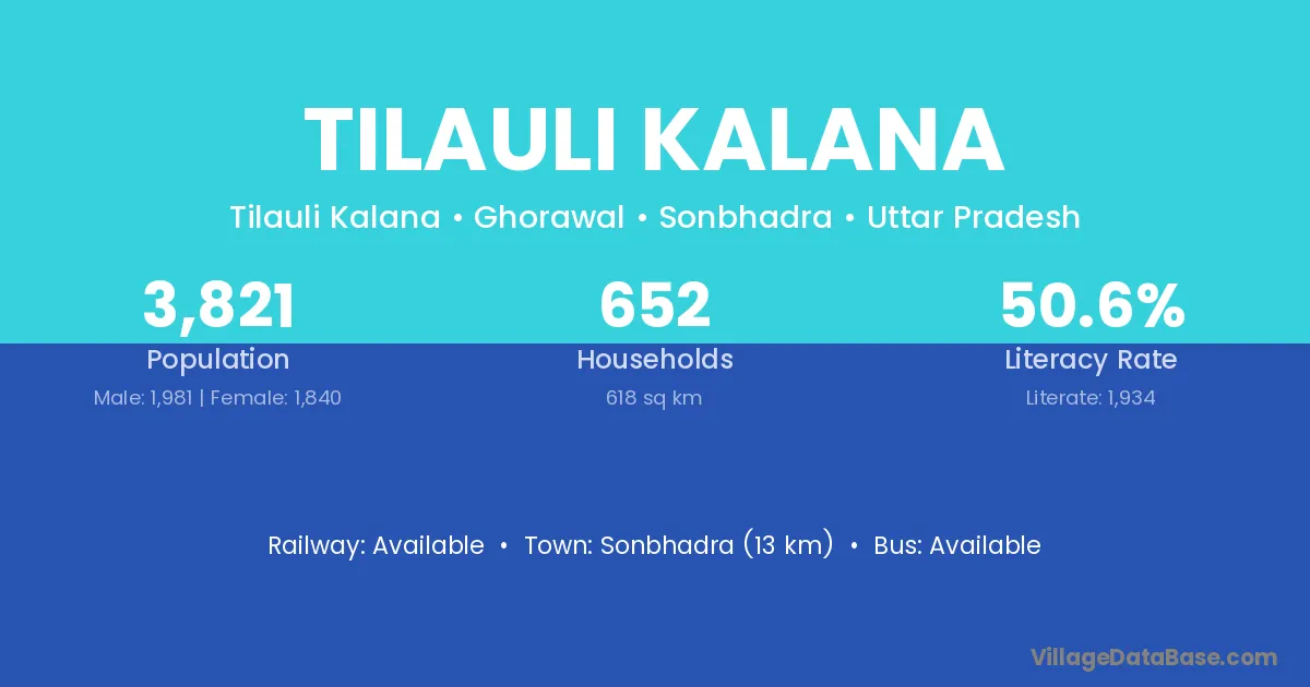 Sonbhadra (13 km) is the nearest town to Tilauli Kalana village for major economic activities and is located approximately 13 km away.
