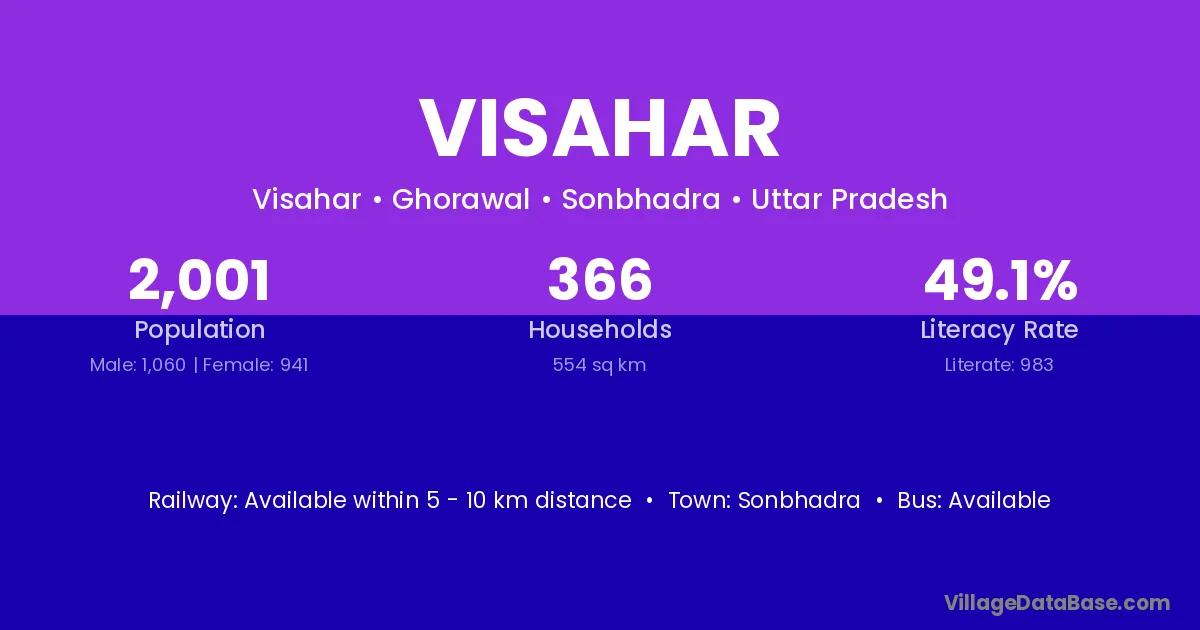 Visahar village has a total population of 2,001 people, of which 1,060 are males and 941 are females.