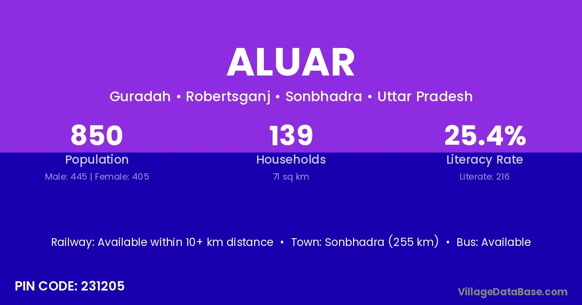 Sonbhadra (255 km) is the nearest town to Aluar village for major economic activities and is located approximately 255 km away.