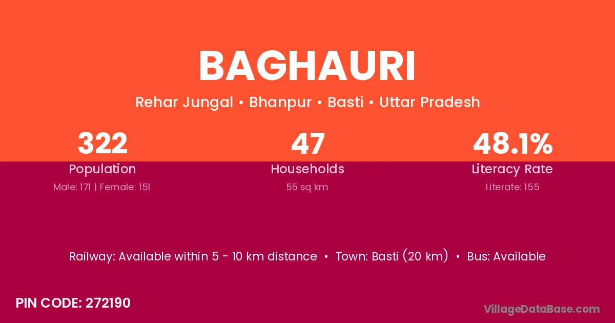 The literacy rate of Baghauri village is 44.07%. Male literacy stands at 57.33% and female literacy at 34.31%.