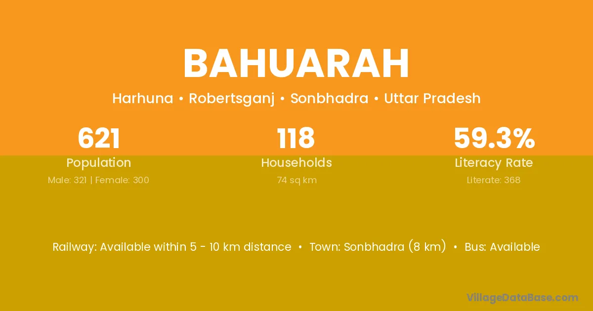 Sonbhadra (8 km) is the nearest town to Bahuarah village for major economic activities and is located approximately 8 km away.