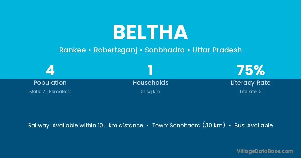 Sonbhadra (30 km) is the nearest town to Beltha village for major economic activities and is located approximately 30 km away.