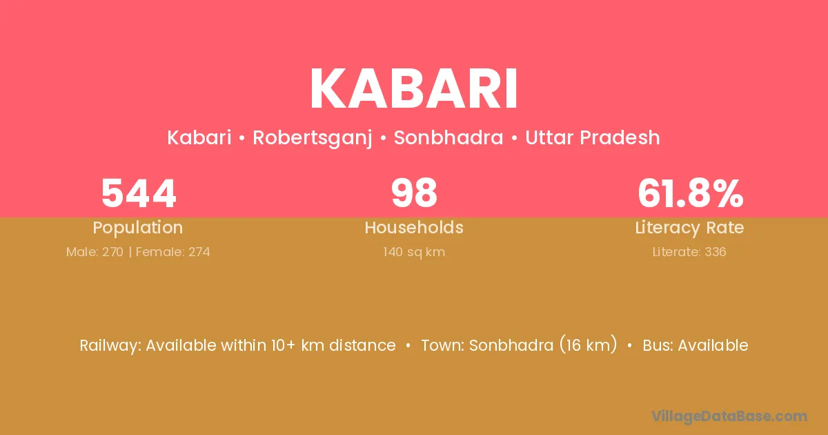 Sonbhadra (16 km) is the nearest town to Kabari village for major economic activities and is located approximately 16 km away.