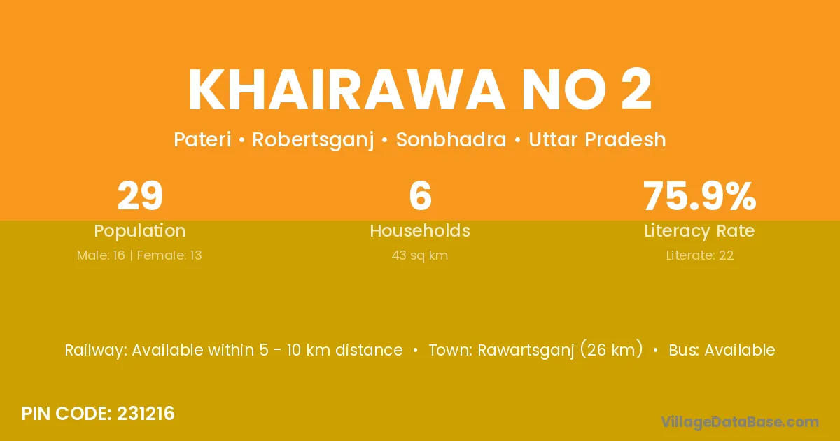 Khairawa No 2 village has a total population of 29 people, of which 16 are males and 13 are females.