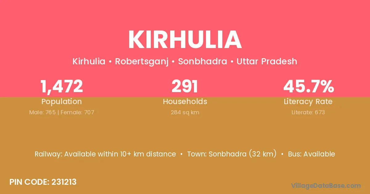 Sonbhadra (32 km) is the nearest town to Kirhulia village for major economic activities and is located approximately 32 km away.